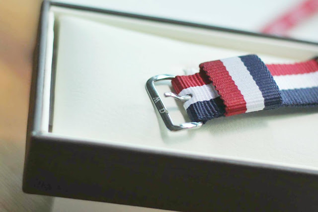 "Inspired by the gorgeous colors of a classic flag, this red, white and blue NATO band celebrates timeless preppy American fashion. The playful band, when paired with the simplistic and elegantly slim dial, gives you a timepiece that can be worn to both work and after work. The ultra-thin (6mm) Daniel Wellington watch is suitable for every occasion. Whether you are attending a formal event, playing a game of tennis or enjoying a sunny day at the country club – Daniel Wellington makes for a beautiful companion. Not only that, but with interchangeable straps you will have a unique timepiece for every day of the week."